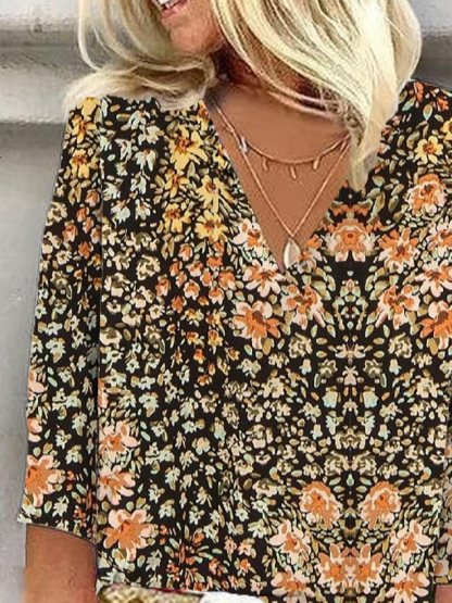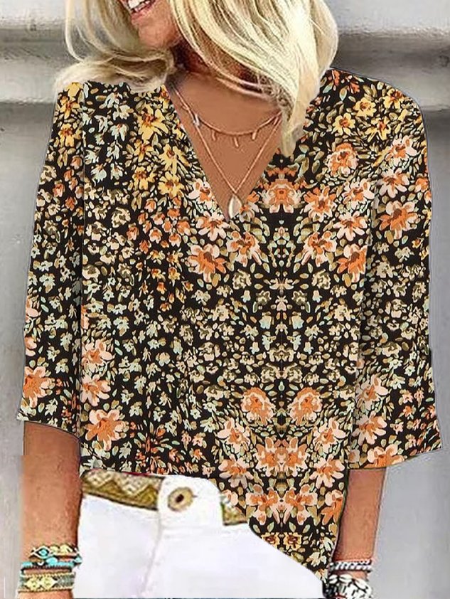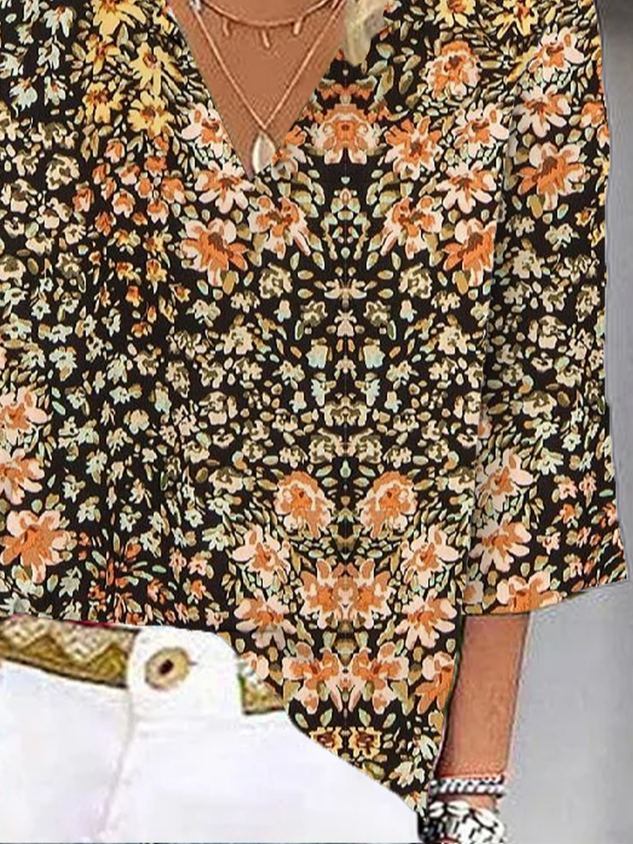 Casual Floral Loose V Neck Blouse
