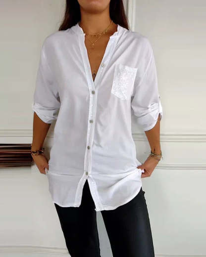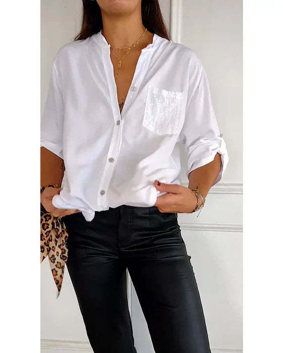 ✔ Elegant Sequin Detailing: The sequined trim and pocket add a sparkling touch that elevates this top from basic to bold.