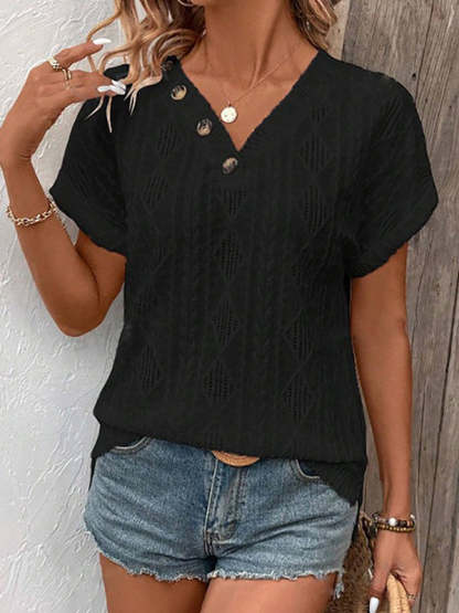 Loose Short Sleeves Buttoned Solid Color V-Neck T-Shirts Tops