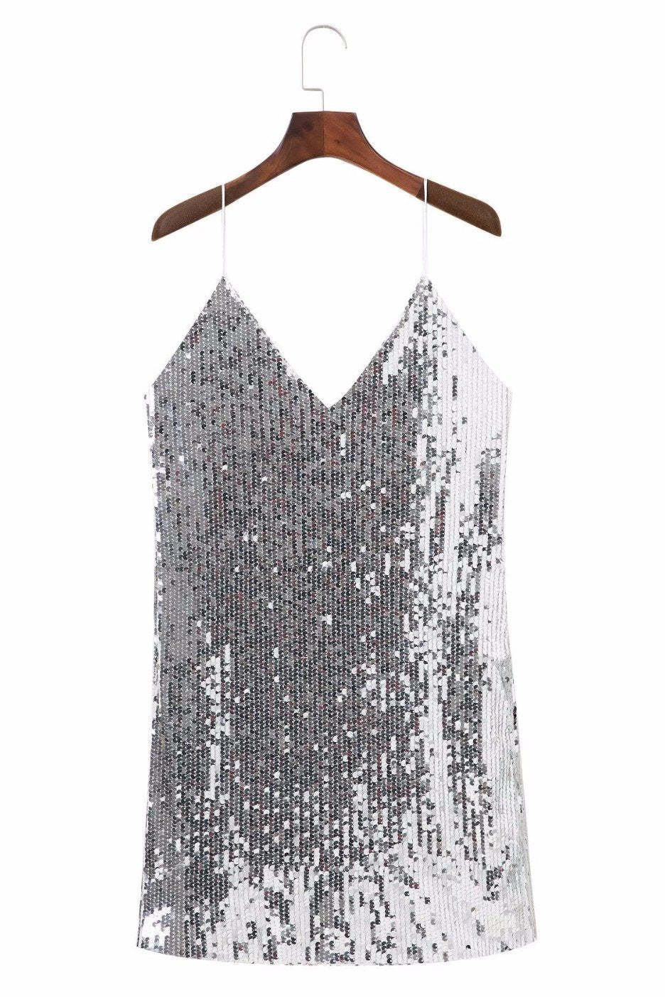Dazzling spaghetti strap sequin embellished mini dress.